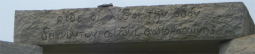 - A shorter message appears on the four vertical surfaces of the capstone, again in a different language and script on each face. The explanatory tablet near the Guidestones identifies these languages/scripts as Babylonian Cuneiform (north), Classical Greek (east), Sanskrit (south), and Egyptian Hieroglyphs (west), and provides what is presumably an English translation: “Let these be guidestones to an age of reason.”