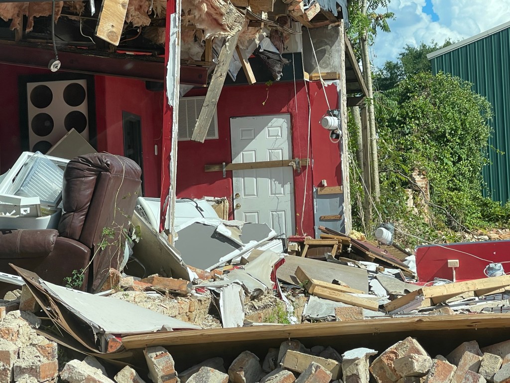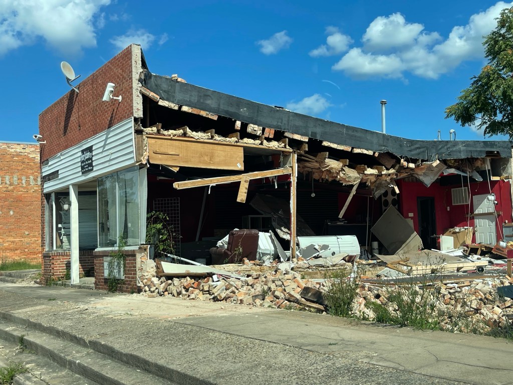Several years ago the building next to this one burned down, weakening the shared wall between the buildings. A severe thunderstorm came through while we were on vacation, and this is the result. The entire side wall of the building blew down.